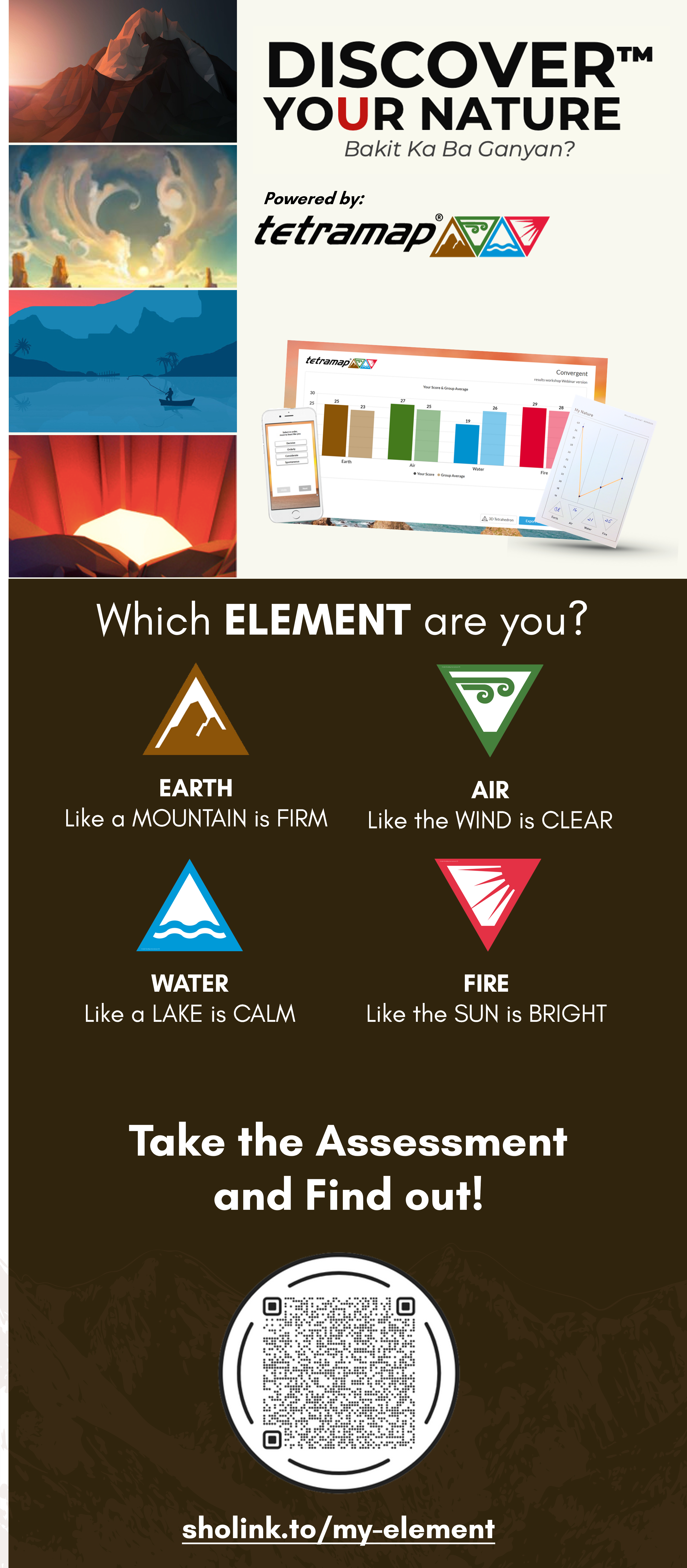 A powerful tool from New Zealand, TetraMap® offers individuals a deeper understanding of themselves and how to work with the people around them. The heart of TetraMap® uses nature as a metaphor that maps out into four elements: Earth, Air, Water, Fire in understanding human behavior. Each of the elements is used to describe different human characteristics.